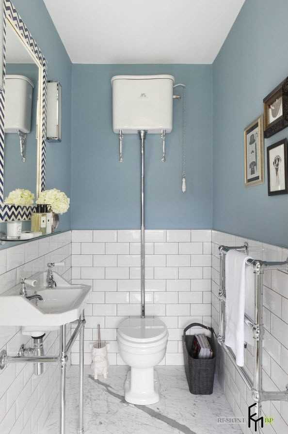 Еще один традиционный способ оформления стен санузла – облицовка белоснежной плиткой «метро» с темной затиркой примерно до середины поверхностей, а деле окраска в нейтральный оттенок, который можно повторить в аксессуарах или предметах декора.