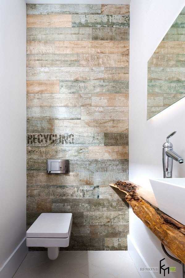 Аналогичный пример плитки, но уже цвета выбеленного дерева. Если с пространством душевой кабины, очевидно, что необходимо облицовывать все поверхности, то в зоне туалета плитку можно сэкономить, окрасив одну из стен водоэмульсионной краской или наклеив обои.