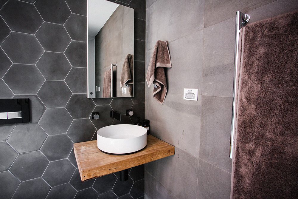 Довольно часто дизайнеры комбинируют их в отделке или же отдают предпочтение керамограниту. Например, в реализованном проекте дизайнера Ксении Крыловой на стенах уложена керамическая настенная плитка Terraviva Cannella 40×80 в сочетании с керамогранитом под бетон Millennium Iron 60×120 с натуральной поверхностью. Этим же «бетоном» облицован пол в санузле.