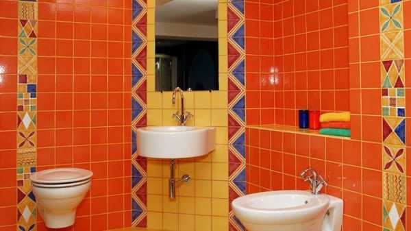 В подобном случае контрасты не должны быть излишне резкими, и какого-либо одного насыщенного цвета должно быть меньше. Например, если основной тон будет синим, то на его фоне уместно будут выглядеть вертикальные полосы из оранжевого кафеля. Для завершенной композиции можно добавить вкрапления нескольких плиток насыщенного цвета с декором. Также допустимо выложить горизонтальную полосу с чередованием небесного и оранжевого оттенков возле раковины. Использование яркого фриза поможет разбавить скучную однотонную плоскость стены и внесет разнообразие в интерьер.