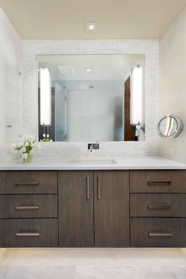 Плитки могут быть разнообразными по размеру, одна коллекция может включать прямоугольные плитки и квадратные, исключением является мозаика, которой часто покрывают не только стены, но и пол. Мозаика вообще смотрится очень эффектно, но из-за большого количества швов, дольно трудоемка в уходе. В случае с коллекцией с прямоугольными плитками, то они укладываются на стену, а квадратные на пол. Очень эффектно смотрится крупная плитка квадратной формы, уложенная на полу. Кстати, в последнее время модной тенденцией считается выделение швов между темными плитками белой затиркой, так вот будьте готовы к тому, что со временем, даже при частой уборке швы потемнеют. Но если Вы все же точно решили швы делать именно белыми, то рекомендуем их чистить зубной щеткой со стиральным порошком, а также губкой жесткой стороной, если потемнение не пропадает, тогда смешать с водой отбеливатель, и аккуратно вылить его на темные участки некогда белых межплиточных швов, спустя пару часов швы посветлеют.