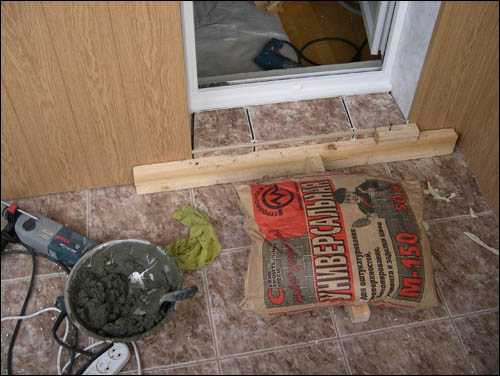 - Установить опалубку. Для этого нужна доска по ширине и высоте немного больше, чем размер порожка – её нужно просто плотно прижать стене любыми тяжёлыми предметами.