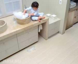 Для укладки в ванной комнате использован влагостойкий ламинат