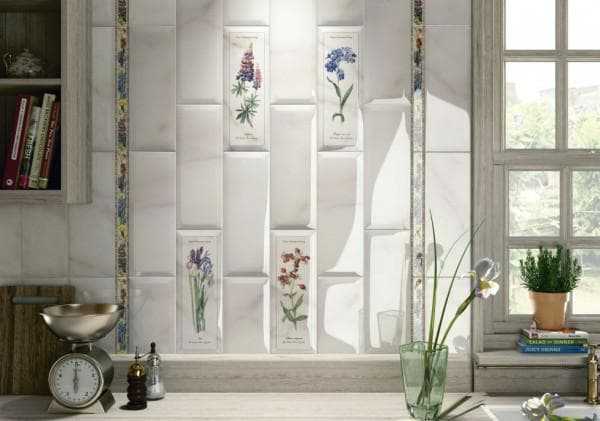 Совмещая в одной плоскости фактурную и гладкую плитку, можно делать рельефные вставки в зонах менее всего подверженных загрязнению и ровные участки в самых проблемных местах. Оригинальным решением также будет создание декоративного панно. Так, например, яркая и жизнерадостная испанская коллекция Pamesa Agatha 25×25 одновременно включает как базовую гладкую керамику, так и несколько вариантов элементов с рельефом.