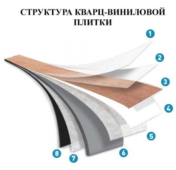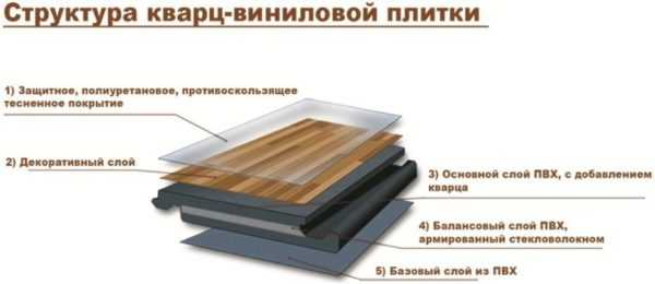 Кварцвиниловая плитка состоит из кварцевого песка и поливинилхлорида. Кварцвиниловая плитка одновременно прочная, как керамика и эластичная, как линолеум. Конструкция кварцвиниловой плитки – слоеный «пирог», технология производства кварцвиниловая плитки– высокотемпературное прессование.