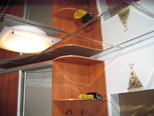 Отражающая поверхность во всю стену отлично смотрится в небольших квадратных или узких прихожих. Иногда вместо обычных дверей в гардеробных делают створки с подобным покрытием. Дизайн модели может быть дополнен рисунком, принтом или аппликацией.