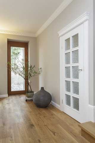 Если дверное полотно у вас белого цвета, и вы не знаете, какой цвет пола к нему подобрать, то посмотрите ещё раз предыдущую часть статьи. Принцип тот же. С ним будут сочетаться напольные покрытия в цвете беленый дуб. Можно попробовать с каким-то из оттенков, но есть риск смешения цветов.