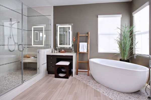 Ванная комната словно специально предназначена для использования белого напольного покрытия. Ведь белый пол в ванной добавляет объём этому обычно скромных размеров помещению, делает его интерьер чище.