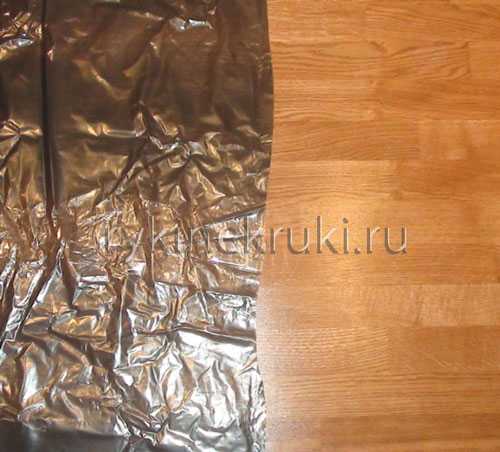 Первым делом необходимо разрезать пленку, чтобы из 1,5 метров ширины получить 3 метра. После этого начинаем ее кроить и накрывать паркет: