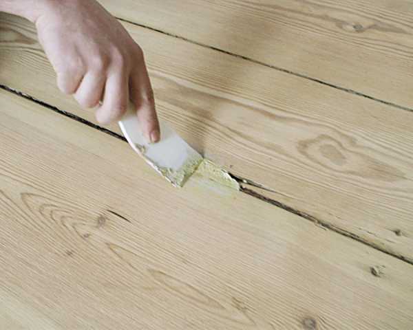 Затем шпаклюют все стыки и изъяны по полу. Для этих целей подойдет заводская шпаклевка либо же пыль, оставшаяся после шлифовки с клеем ПВА. Она придаст нужный оттенок.