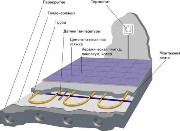 Примерная схема устройства водяного пола с регулятором температуры и датчиком