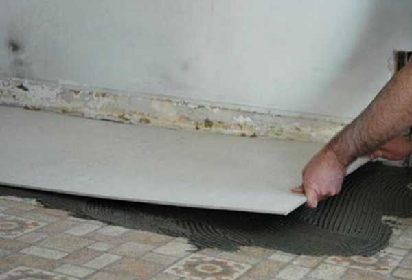 Для выравнивания бетонного или деревянного пола можно использовать цементные листы толщиной 1-1,5 см. Если основание пола относительно ровное, то плиты можно приклеить прямо на него, не выполняя обрешётку из бруса.