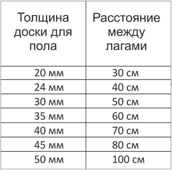 Распределять брус на поверхности допускается согласно утверждённым параметрам в зависимости от толщины доски. Чтобы самостоятельно определить эту величину, можно руководствоваться приведённой ниже таблицей.