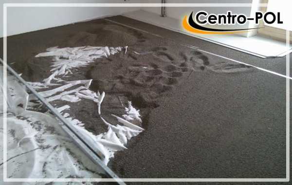 - Между направляющими засыпается сыпучий материал. Чаще используется керамзитовый песок. Он трамбуется и разравнивается правилом по балкам.