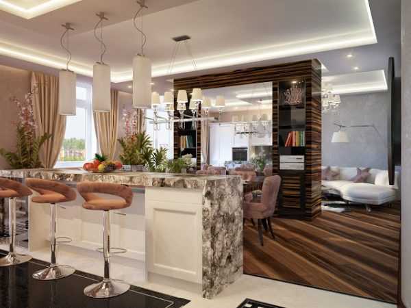 При комбинировании отделки стоит учитывать сочетания. Какой сделать выбор, подскажет материал. К примеру, кафельная плитка не очень хорошо «дружит» с линолеумом, а серый или светлый ламинат с коричневым или черным мрамором. Декор отделки маленькой или большой кухни должен быть схож по цвету или фактуре. Лучше, если различность материалов выполняет функцию зонирования в интерьере.
