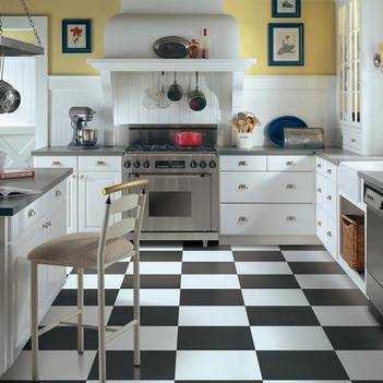 Мнение о том, что комбинациями в интерьере лучше заниматься профессионалам, устарело. Сейчас каждый может создать композицию сразу из нескольких материалов, и не важно, какой лучше декор: белый кафель или темный линолеум, черная плитка или серый мрамор. Сделать выбор можно в пользу белого линолеума, который смотрится гармонично со светлым, серым кафелем на стенах и белой мебелью. Подобный декор актуален для маленькой кухни, где выбор зонирования усложняется из-за недостатка квадратных метров. В просторной кухне можно осуществить зонирование, постелив светлый, серый или белый линолеум в обеденной части кухни и коричневую, черную либо светлую плитку в рабочей зоне.