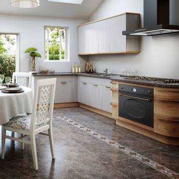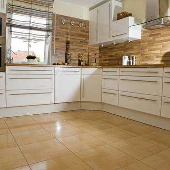 При сравнении керамической плитки с прочным мрамором и теплым ламинатом, плитка выступает на первое место. Это подходящий материал, предназначенный для кухни как маленькой, так и просторной. Так же, как и ламинат, плитка способна имитировать любые фактуры и материалы. Матовые покрытия всегда защищены дополнительным слоем, а установка происходит не только быстро, но и дешево. Есть лишь одно условие, чтобы дома было тепло, лучше оснастить пол системой подогрева. Что касаемо кафеля, то такой материал специалисты рекомендуют использовать для отделки стен и фартука кухни. Кафель менее прочен, поэтому при покупке стоит интересоваться способом изготовления и облицовки материала.