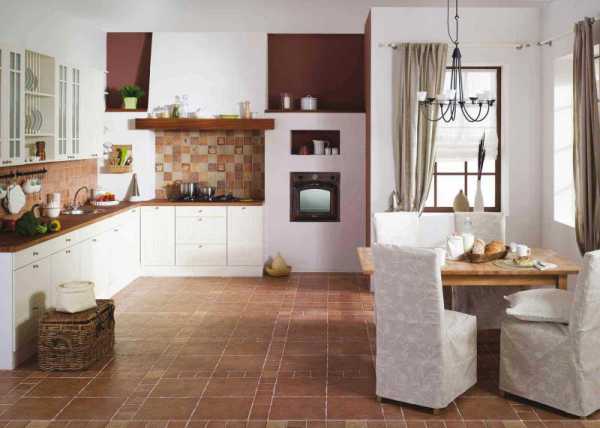 На кухне лучше класть плитку, поверхность которой рифленая, чтобы не допустить случайных падений.