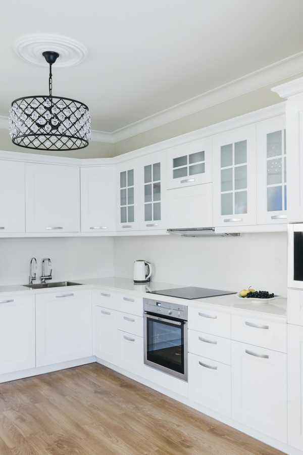 белый считается универсальным цветом — его легко подстроить под фартук и обновить, усовершенствовать с помощью интерьерных наклеек;