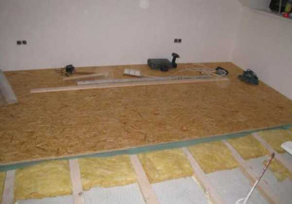 Совет! Если есть необходимость добиться дополнительной шумо- и теплоизоляции, тогда под ДСП в пространство между лагами укладывается каменная вата, которая сверху закрывается еще одним слоем гидроизоляции.