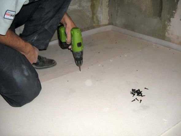Плиты крепятся к полу при помощи саморезов и дюбелей. Каждый саморез необходимо затягивать руками до того момента, когда его шляпка уйдет под поверхность ДСП. Затем места крепления замазываются шпатлевкой и шлифуются.