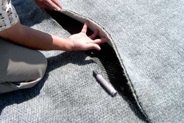 Однако есть и недостаток: стеклохолст очень непрочен, рвется и расслаивается при резких рывках. Поэтому работать с ним при укладке стоит осторожно. Главным положительным достоинством стеклохолста, помимо низкой цены рулонного покрытия, выступает полное отсутствие гниения, больший срок службы по сравнению с картонным основанием.