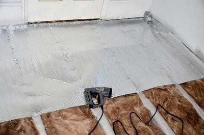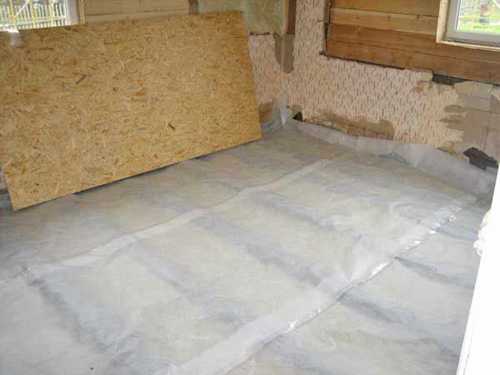 - Укладывается утеплитель (если это предусмотрено планом строительства.). Сверху утеплителя расстилают пароизоляционную пленку и закрепляют ее к лагам.