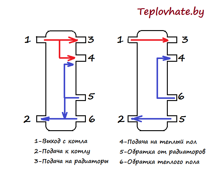 Она представляет собой полую трубу расчетного сечения, чьей задачей является создание зоны нулевого давления между теплогенератором и несколькими потребителями. Как действует этот элемент в схеме обвязки котла, описано в следующем разделе.