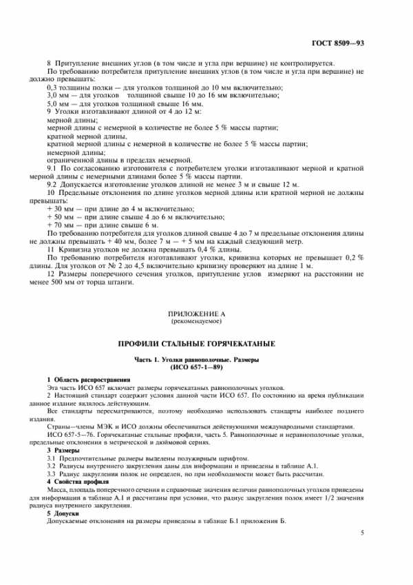 Настоящий международный стандарт регламентирует предельные отклонения размеров горячекатаных стальных равнополочных и неравнополочных уголков в метрической и дюймовой сериях. Размеры уголков в метрической серии должны соответствовать ИСО 657-1 и ИСО 657-2, в дюймовой — ИСО 657-3 и ИСО 657-4.