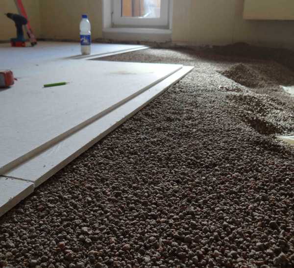 Затем производится раскрой гипсоволокна с учетом кромочных зазоров и насыпается утеплитель. Лучше если это будет мелкофракционный керамзит, карьерный или речной песок. Аморфный утеплитель выравнивается по размеченным посредством уровнеметра меткам. Минимальная толщина засыпки — 20 мм.