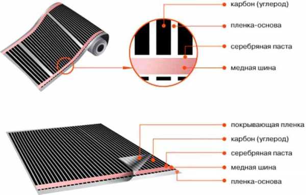 Пленочный пол состоит из карбоновой смеси, которая запакована в пленку из полиэстера. Между двумя прослойками располагается углеродная наноструктура, способствующая выработке инфракрасного излучения. Элементы углеродного материала соединяются при помощи меди. При прохождении тока через эти элементы происходит нагрев поверхности всех предметов в радиусе излучения.