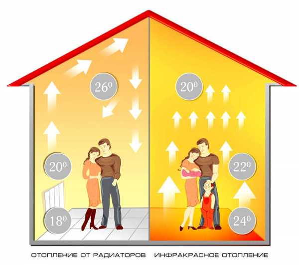 Данный способ обогрева характеризуется волновым излучением, то есть нагревается не воздух, а предметы — ну а они, в свою очередь, также отдают тепло. Это крайне положительное качество, так как отсутствует циркуляция пыли, как при радиаторном отоплении.