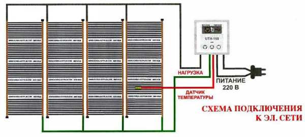 Схема подключения пленочной системыИз технических характеристик у теплого пола стоит отметить следующие показатели: