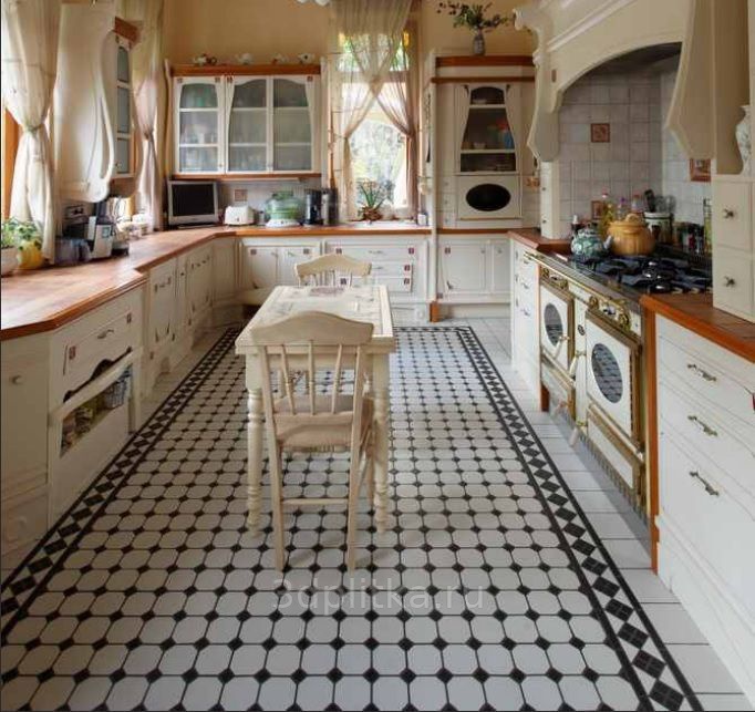 Напольное кафельное покрытие в интерьере кухни.Многообразие кафельной плитки для пола настолько богато, что требуемый материал можно подобрать под любой дизайнерский проект кухни. Плитка может иметь разные размеры и формы, цветовые отделки и орнаменты, или же быть однотонного типа.