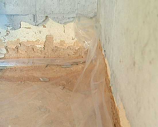 Первым делом перекрытие должно быть отремонтировано (в случае выявления крупных трещин или сколов), а также очищено от мусора и пыли. Все щели и выемки в перекрытии, а также стыки между ними и стенами можно заделать монтажной пеной или быстротвердеющим строительным раствором. Мусор нужно убирать вот почему: если гидроизоляционный материал (а он укладывается первым слоем) постелить на грязный бетон, то он может быть поврежден острыми краями камешков и не сможет выполнять свои функции в полной мере.