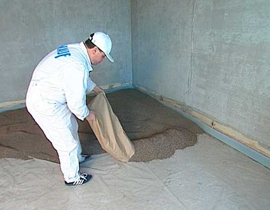 Выравнивание слоя засыпки правиломЗасыпку можно производить керамзитом, шлаком или специальной засыпкой. Если выбор пал на керамзит, то нужно обратить внимание на то чтобы гранулы были не очень большими для большей равномерности. Толщина такого слоя должна быть 30 мм как минимум. Для удобства засыпку следует производить частями. Каждая порция керамзита выкладывается по уровню маяков. Некоторые сначала делают полную засыпку на весь пол полностью, а затем выравнивают ее по маякам.