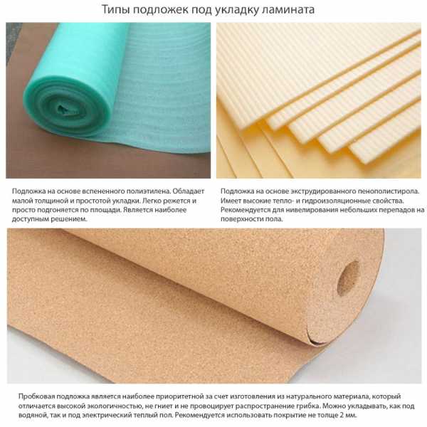 Π ΠΊΠ°ΡΠ΅ΡΡΠ²Π΅ ΠΏΠΎΠ΄Π»ΠΎΠΆΠΊΠΈ ΠΏΠΎΠ΄ Π»Π°ΠΌΠΈΠ½Π°ΡΠ° ΠΌΠΎΠΆΠ½ΠΎ ΠΈΡΠΏΠΎΠ»ΡΠ·ΠΎΠ²Π°ΡΡ ΠΏΠΎΠΊΡΡΡΠΈΡ Π½Π° ΠΎΡΠ½ΠΎΠ²Π΅ Π²ΡΠΏΠ΅Π½Π΅Π½Π½ΠΎΠ³ΠΎ ΠΏΠΎΠ»ΠΈΡΡΠΈΠ»Π΅Π½Π°, ΠΏΡΠΎΠ±ΠΊΠΈ, Ρ Π²ΠΎΠΈ ΠΈ Ρ.Π΄. ΠΠ°ΠΈΠ±ΠΎΠ»Π΅Π΅ ΠΎΠΏΡΠΈΠΌΠ°Π»ΡΠ½ΡΠΉ Π²Π°ΡΠΈΠ°Π½Ρ β ΡΡΠΎ ΠΏΠΎΠ΄Π»ΠΎΠΆΠΊΠ° ΠΈΠ· Π½Π°ΡΡΡΠ°Π»ΡΠ½ΠΎΠΉ ΠΏΡΠΎΠ±ΠΊΠΈ, ΡΠ°ΠΊ ΠΊΠ°ΠΊ Π΄Π°Π½Π½ΡΠΉ ΠΌΠ°ΡΠ΅ΡΠΈΠ°Π» Π½Π΅ Π²ΠΏΠΈΡΡΠ²Π°Π΅Ρ Π²Π»Π°Π³Ρ, ΠΏΡΠ΅ΠΏΡΡΡΡΠ²ΡΠ΅Ρ ΠΎΠ±ΡΠ°Π·ΠΎΠ²Π°Π½ΠΈΡ ΠΏΠ»Π΅ΡΠ΅Π½ΠΈ ΠΈ Π³ΡΠΈΠ±ΠΊΠ°.