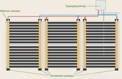 После размещения нагревательная пленка для теплого пола подключается к проводке. Для этого на концах медных полос устанавливаются зажимы, к которым и подключаются проводящие контакты. Все места подключения должны быть изолированы слоем битумной изоляции, в совокупности с местами разреза пленки с обои сторон.