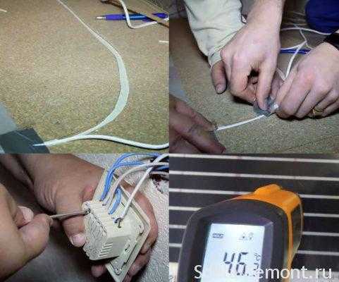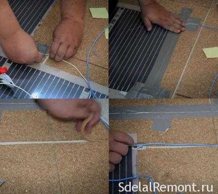 Обращаем внимание наших читателей, что при установке всех датчиков и электрических проводов нужно в обязательном порядке изолировать контакты и места подключения. Чтобы теплый пленочный пол своими руками установился без проблем.