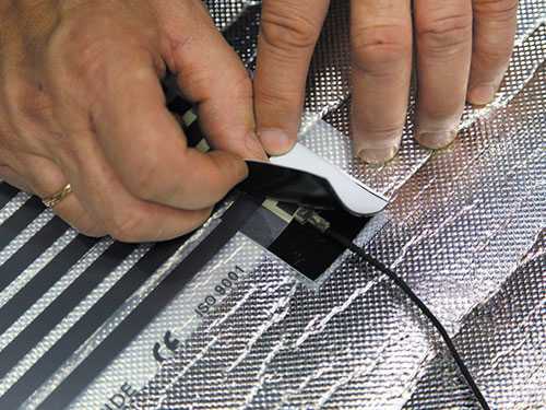 - Теперь подключаем температурный датчик и изолируем его. Для этого датчик устанавливается под пленкой, место его расположения примерно в центре второй секции. Для самого датчика также вырезается отверстие в теплоизоляции, если это необходимо, углубление делается и в основании. Также стоит обустроить и каналы для провода, на всех поворотах делайте плавный изгиб, чтобы провод не сломался со временем.