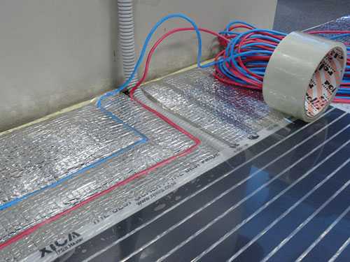 - После чего закрепите пленку к теплоизоляции с помощью скотча. Важно пока оставить открытыми участки для подключения.