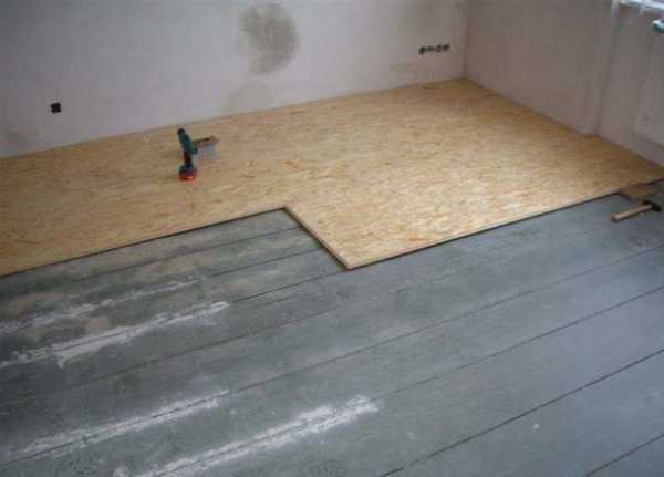 Старый дощатый пол покрыть листами влагоустойчивой фанерыЛисты древесных материалов позволяют распределить нагрузку сразу по нескольким половицам чернового пола. Это защищает от провалов старых дощатых конструкций.
