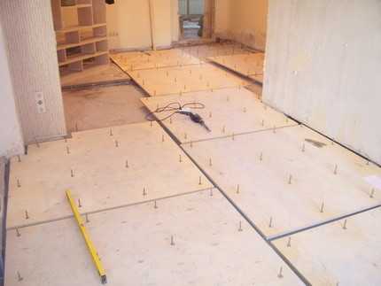 Ход дальнейших работ зависит от выбранного метода подготовки основания. Основные из них – это устройство облегченной стяжки, использование фанеры или полиуретановых клеевых составов.