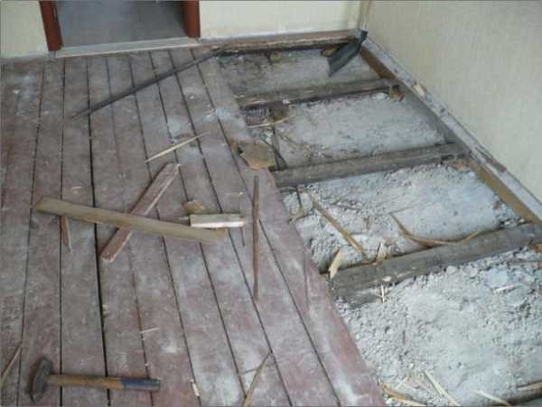 - старый дощатый пол демонтируется, проводится ревизия системы лагов. Если имеются бруски, прочность которых под сомнением, они должны быть заменены.