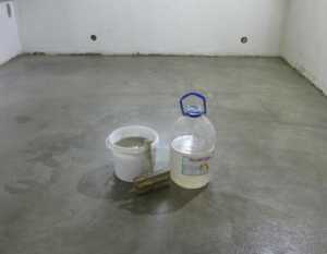 - На поверхность пола наносится слой раствора, состоящего из песка (2 части), жидкого стекла (2 части) и воды. Все компоненты необходимо тщательно перемешать.