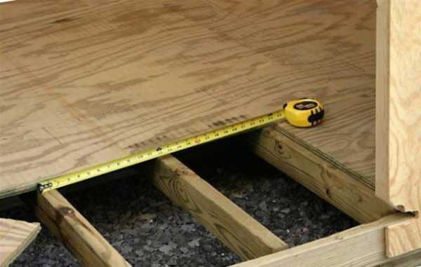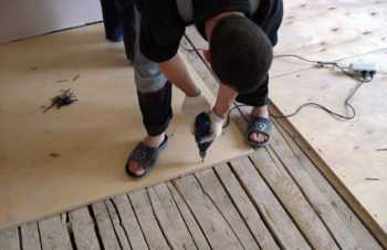 - поверх дощатого настила сделать слой из влагоустойчивой фанеры толщиной не менее 12 мм. Подойдут и другие плиты из прессованной стружки древесины. Располагать листы следует внахлест, и закреплять саморезами с шагом не более в 20 см.