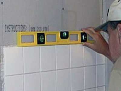 - 1. На высоте второго ряда плитки внизу стены закрепляем планку из дерева. Нам нужно установить ее четко горизонтально. Поэтому придется воспользоваться строительным уровнем.