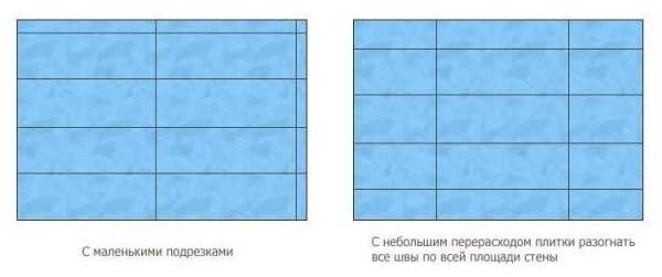 Классический вариант раскладки кафеля на стене – от потолка укладываются целые плитки, а резанные – у самого пола.