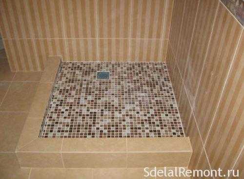 Гидроизоляция душа перед укладкой мозаичной плитки На этом основные подготовительные работы закончены. После высыхания гидроизоляционного материала дополнительно проводится финишная подготовка, которая представляет собой окончательное выравнивание и грунтовку. Выравнивание в данном случае выполняется с помощью плиточного клея, соответственно после его высыхания поверхность грунтуется.Важно! Гидроизоляция выполняется не только по поверхности пола, но также заходит и на стены по высоте не менее чем на 10-15 сантиметров.