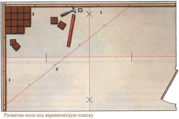 Определившись со способом укладки плитки (прямой, по диагонали), лучше сделать предварительную разметку расположения керамики на полу. Выполняется это для того, чтобы подрезанные элементы при их наличии располагались симметрично относительно выбранных осей симметрии помещения – диагоналей или линий, соединяющих середины противоположных стен. В отдельных случаях, при художественной облицовке пола, монтаж керамики начинают с середины пола или его наиболее открытой обзору зоны.